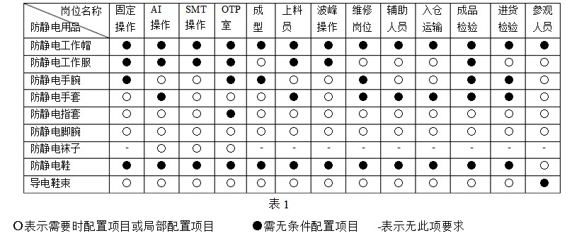 二、電子一般操作崗位了防靜電策略:見(jiàn)附表1:崗位作業(yè)過(guò)程人體防靜電配具表