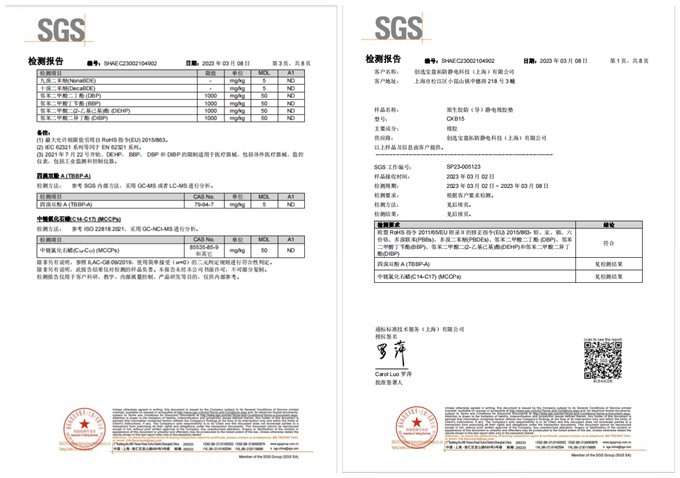 創(chuàng)選寶防靜電膠皮就是橡膠材質(zhì)的,其中是否會含有MCCPs呢?如下是今年初委托SGS檢測的結(jié)果,結(jié)果顯示創(chuàng)選寶生產(chǎn)的防靜電膠皮CXB15系列是不含有該物質(zhì)的,是可以放心、安心使用的一款相對更環(huán)保的防靜電產(chǎn)品。