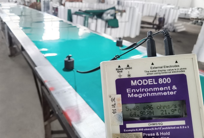 5. 檢測(cè)靜電性能:使用靜電測(cè)試儀檢測(cè)表面電阻率,高質(zhì)量的防靜電膠皮應(yīng)在標(biāo)準(zhǔn)范圍內(nèi)